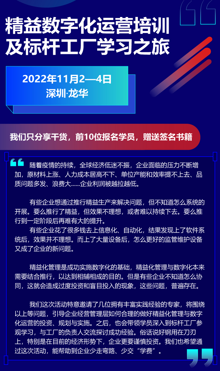 精益數(shù)字化運(yùn)營培訓(xùn)及標(biāo)桿工廠學(xué)習(xí)之旅火熱報(bào)名中!